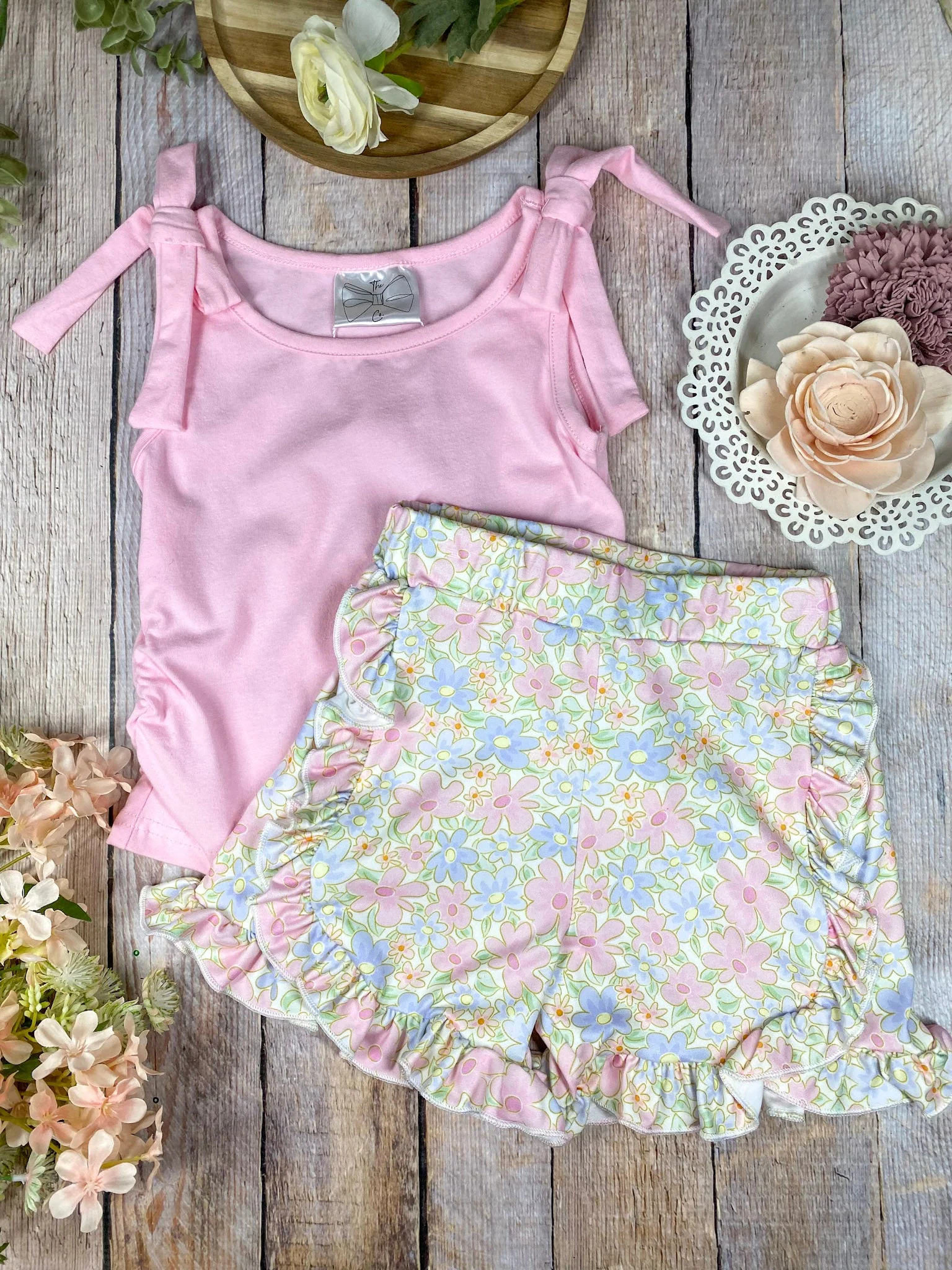 Sweet, simple, and perfect for sunny days. This boutique girls two-piece set features a blush pink sleeveless top with adorable bow-tie shoulder straps, paired with coordinating floral ruffle shorts for an easy, charming warm-weather look.